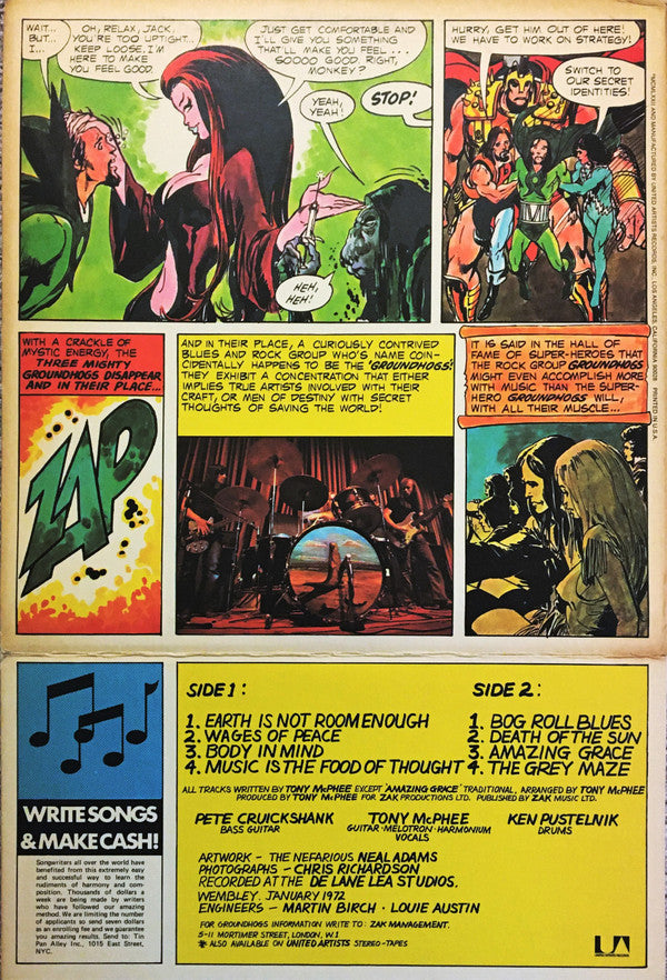 This album was released in a gatefold sleeve with fold out sections to make a comic with a story about "The Mighty Groundhogs".